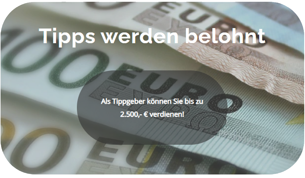 *Die Tippgeberprovision beträgt 10% unserer vereinnahmten Vermittlungsprovision, maximal jedoch 2.500,- €. Sie wird per Banküberweisung gegen Gutschriftsbeleg ausgezahlt. Wir behalten uns das Recht vor, Immobilien oder deren Eigentümer abzulehnen. Der Rechtsweg wird ausgeschlossen. Bei Nichtzahlung unserer Provision folgt keine Auszahlung der Tippgeberprovision. Bei mehreren Tipps zu einem Objekt erhält nur der erste Tippgeber die Vergütung.
